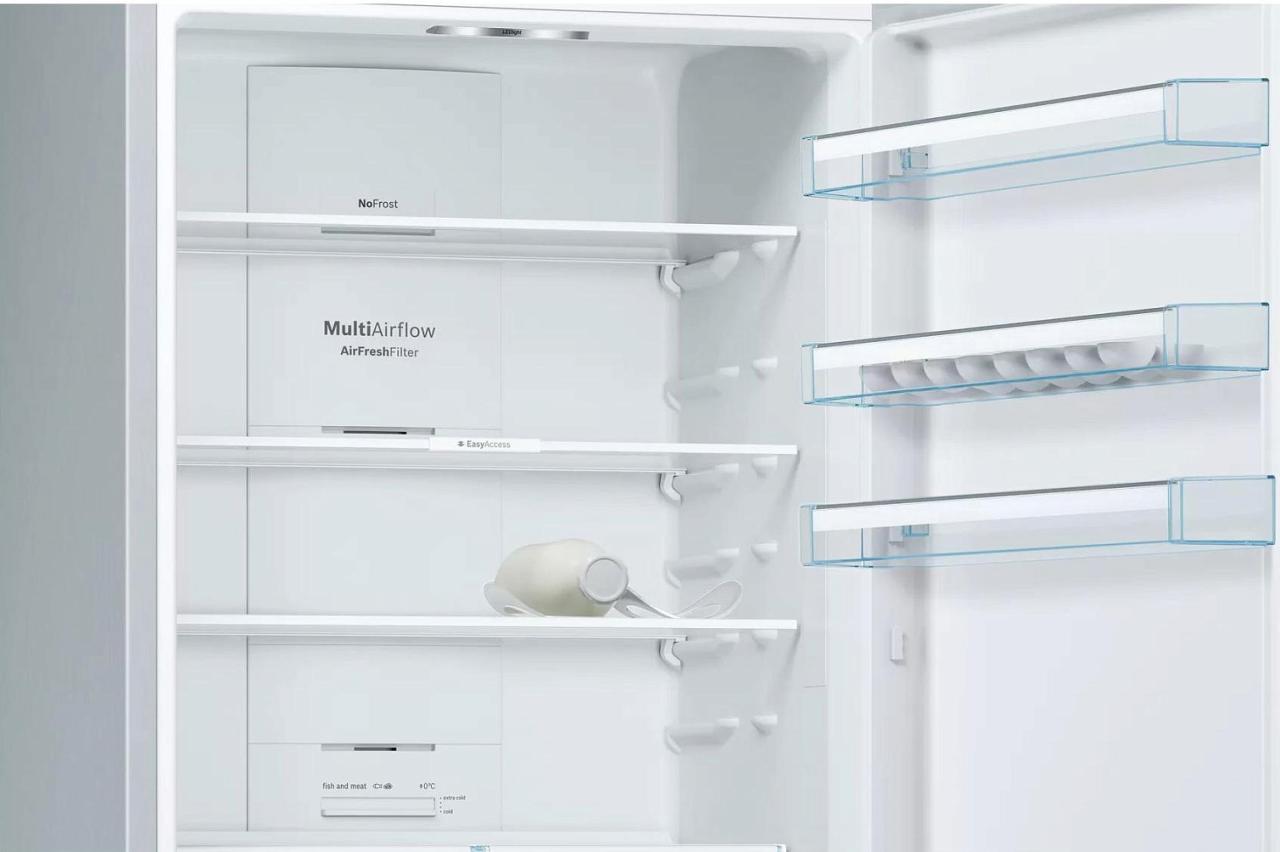 Система охлаждения No Frost предотвращает образование инея в обеих камерах и избавляет от необходимости ручной разморозки. Равномерная циркуляция воздуха за счёт MultiAirflow поддерживает стабильную температуру на всех полках и помогает дольше сохранять свежесть.