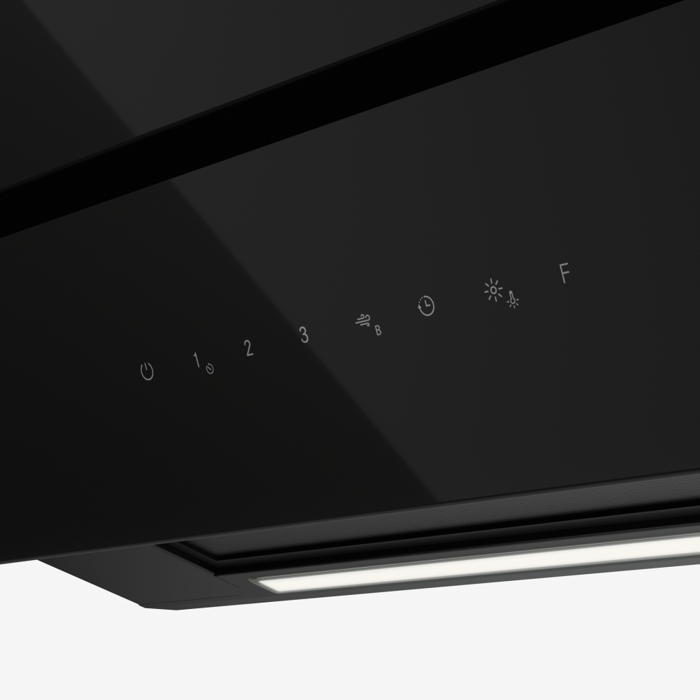 Наклонная конструкция дополняется LED-лентой с регулировкой яркости и теплоты света, чтобы равномерно подсветить варочную поверхность. В комплекте уже предусмотрены угольный фильтр и увеличенный жироулавливающий фильтр, а минимальная высота монтажа 45 см упрощает интеграцию в кухонный проект.